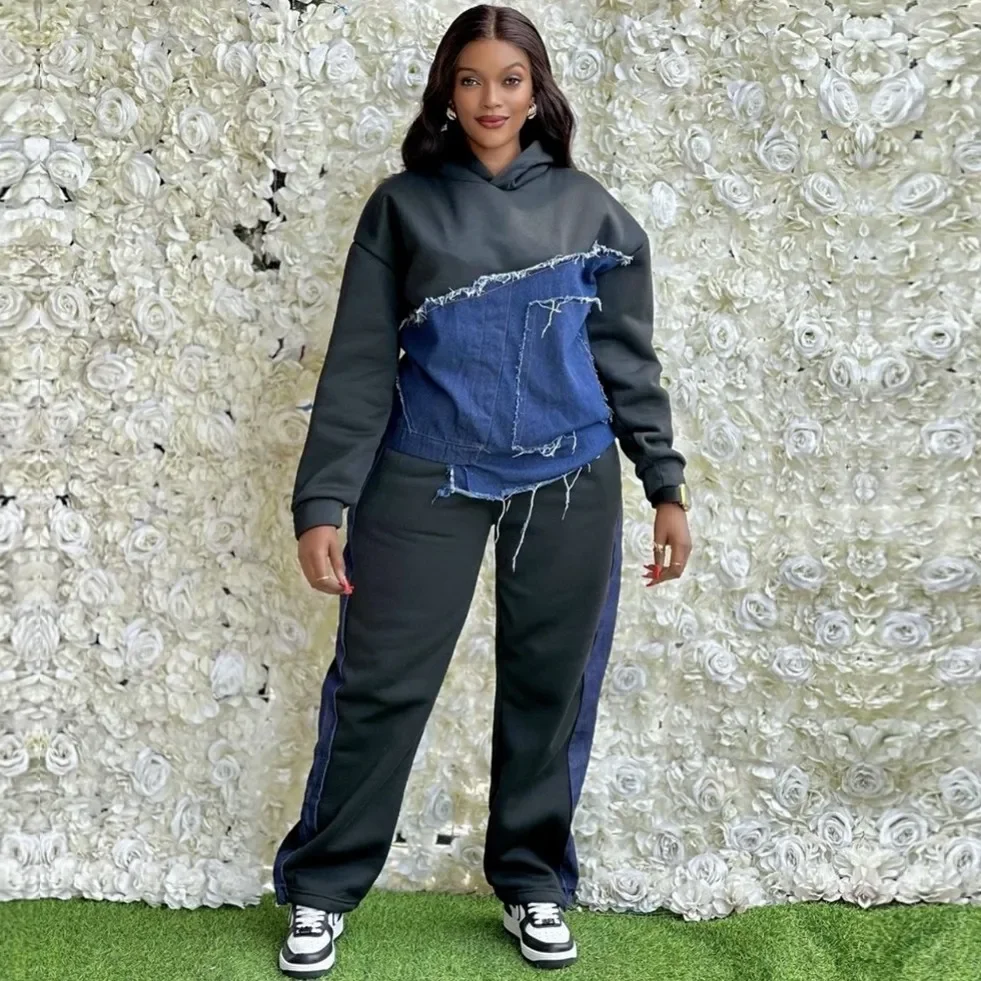 2 Piece Set Hooded Fashion Long Sleeve Denim Top And Pants