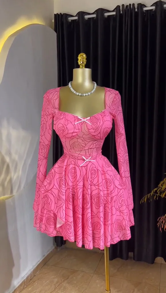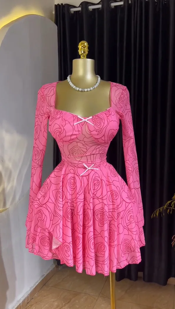 Floral Printed Long Sleeve Bowknot Square Collar Mini Dress