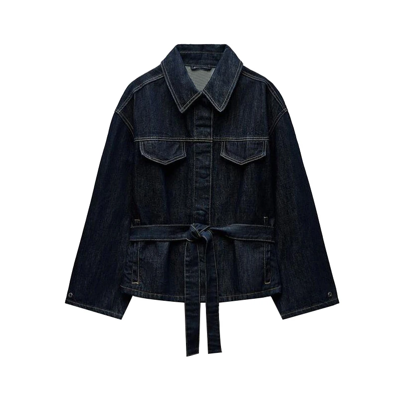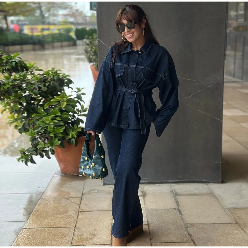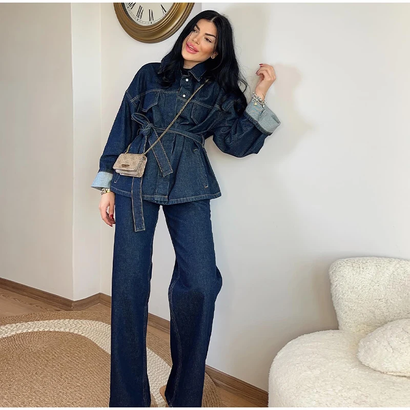 High Street Jeans Suit Women Loose Lapel Long Sleeves Belt Denim Coats Sets