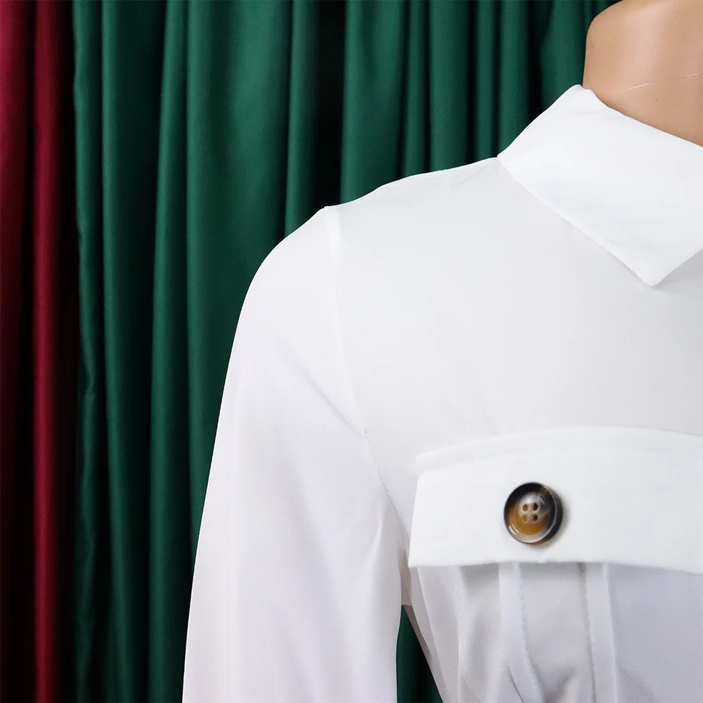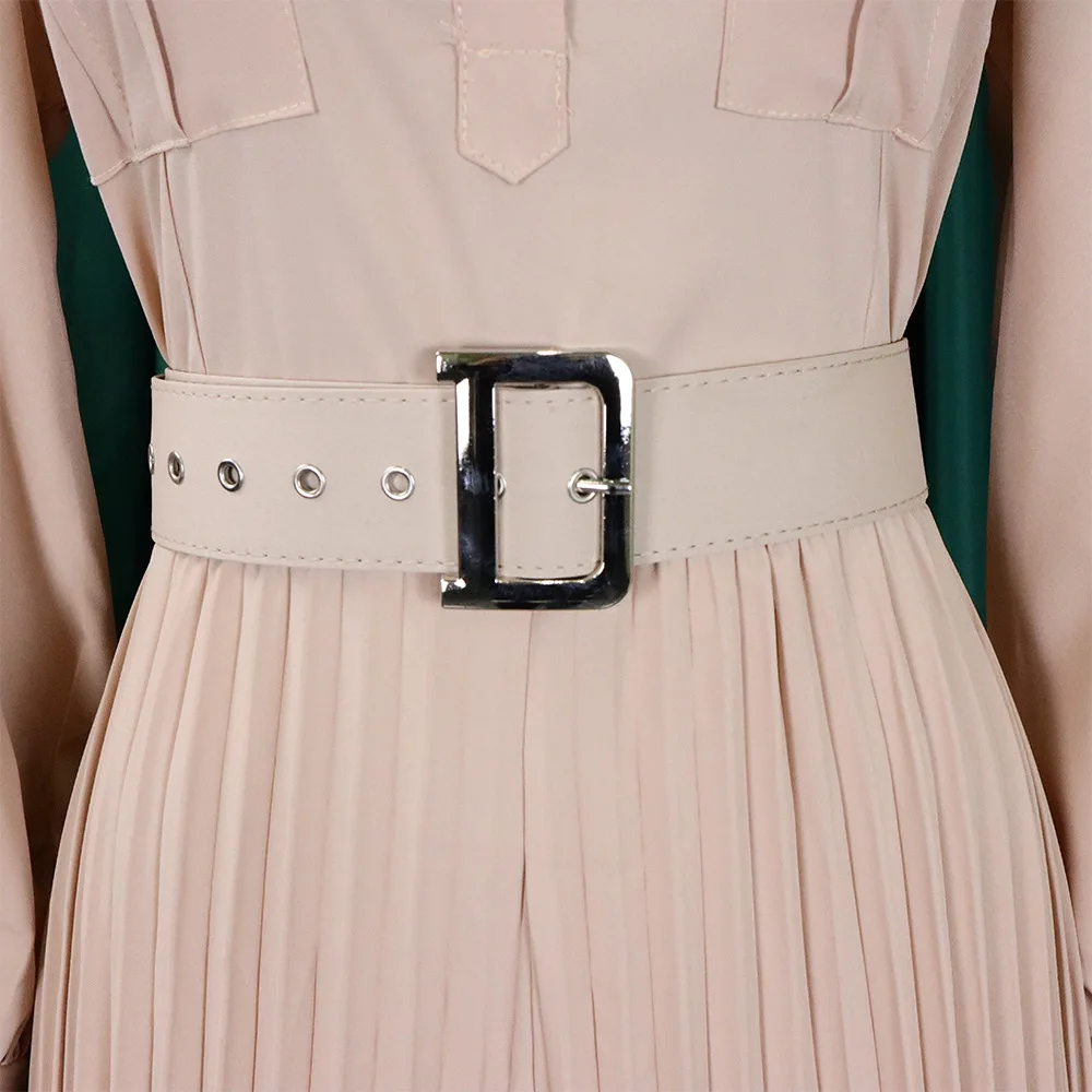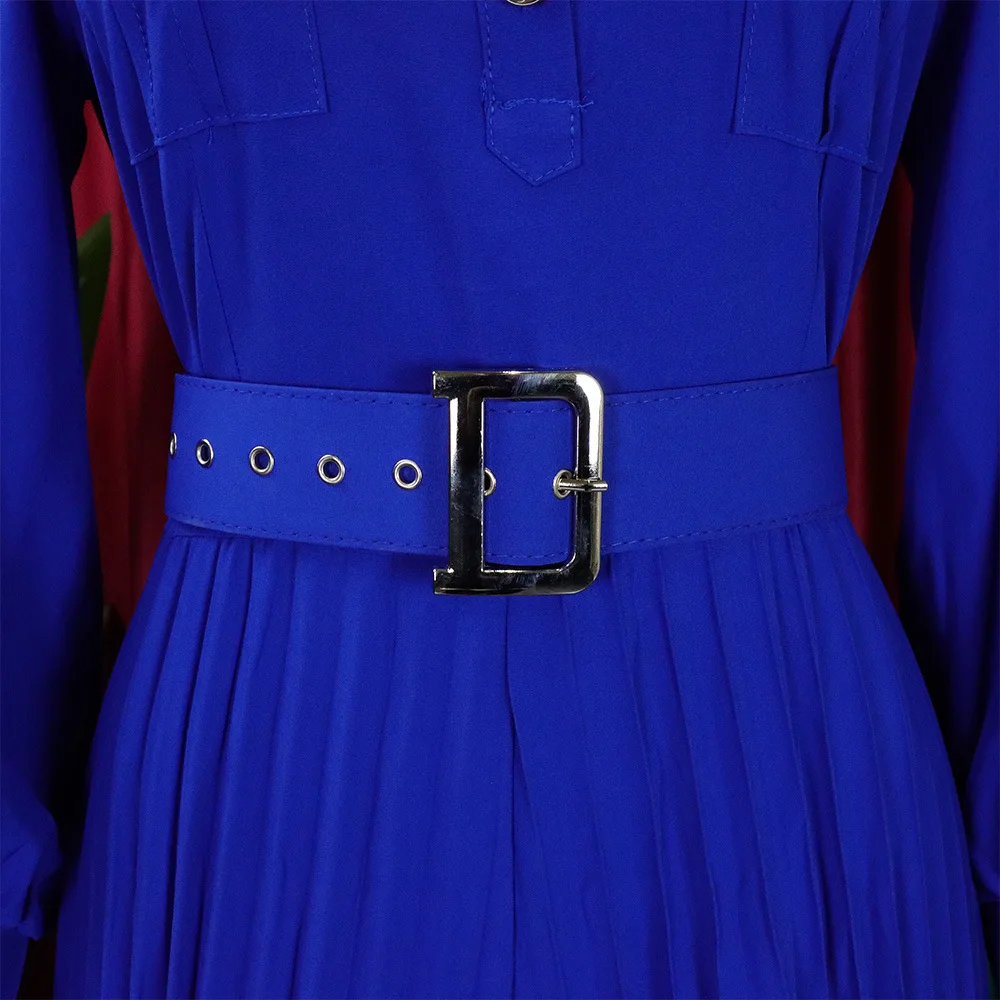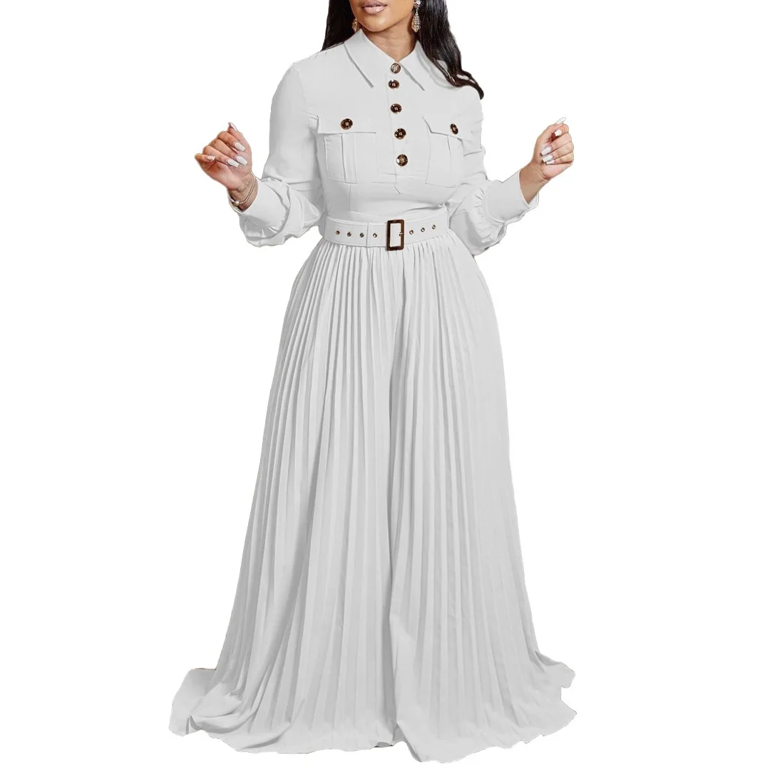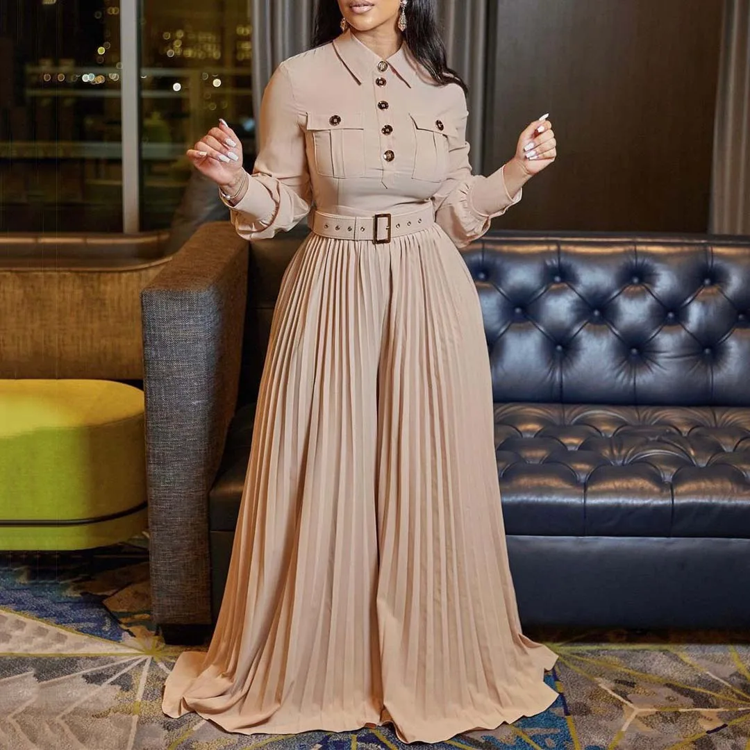 Luxury Pleated Jumpsuits for Women Turn Down Collar Single Breasted Full Sleeve Belt Waisted Floor Length