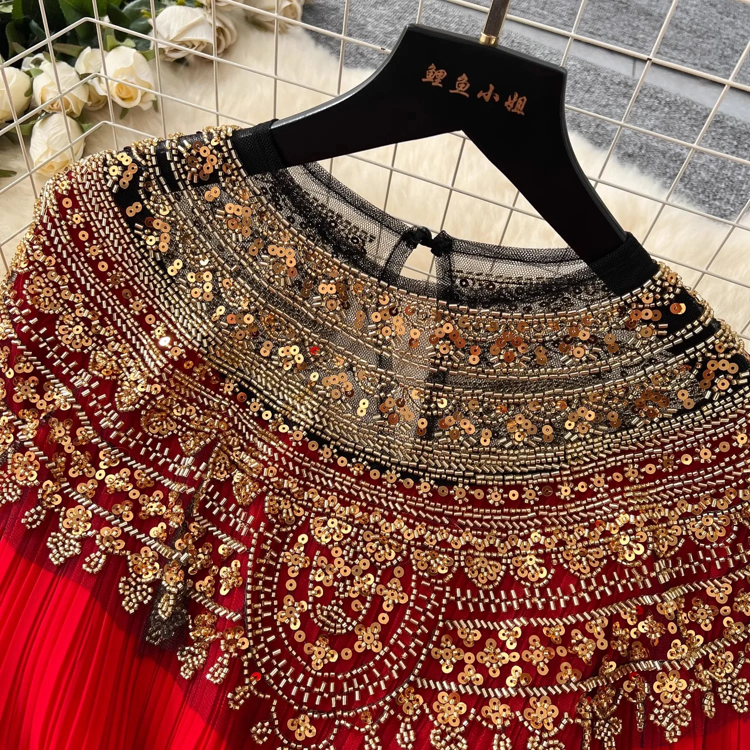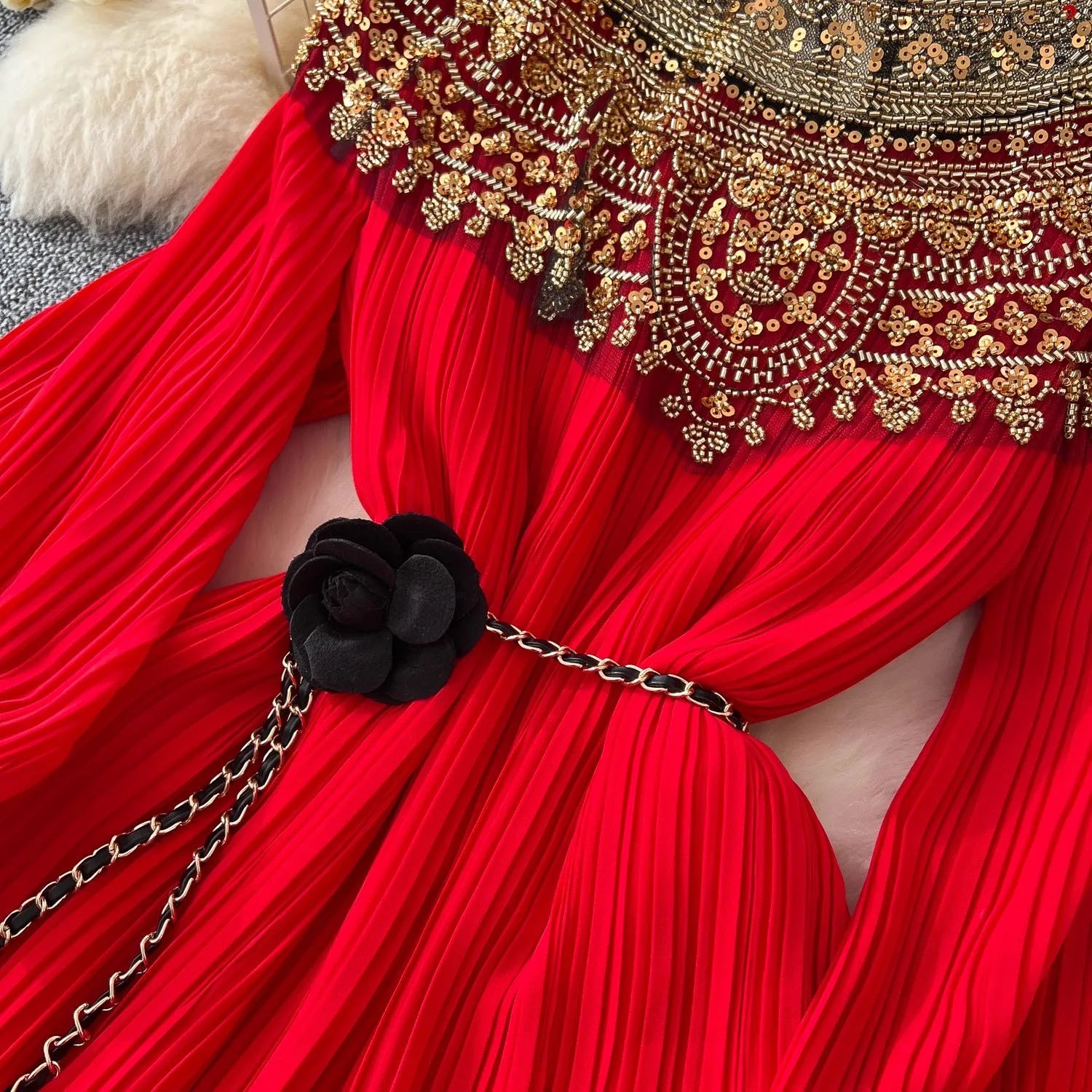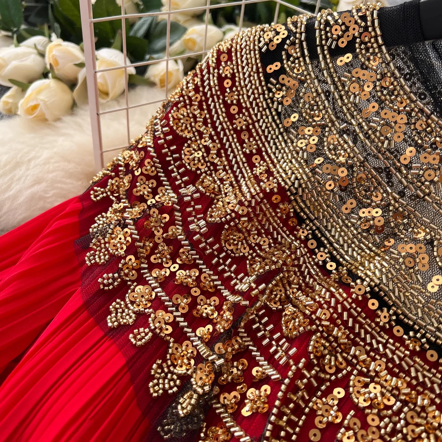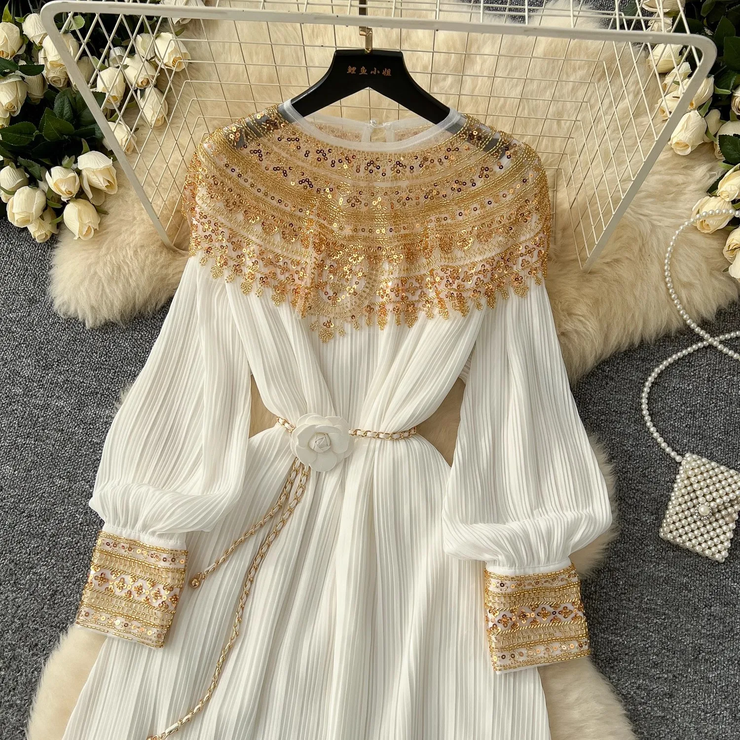 Luxury Shine Sequined Embroidery Beading Cape Splice Chiffon Formal Occasion Dresses Women Floral Belt Loose Robe Party Clothing