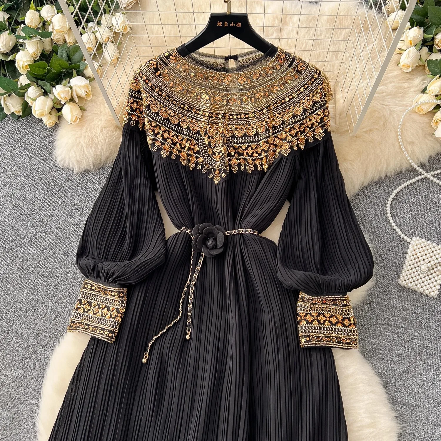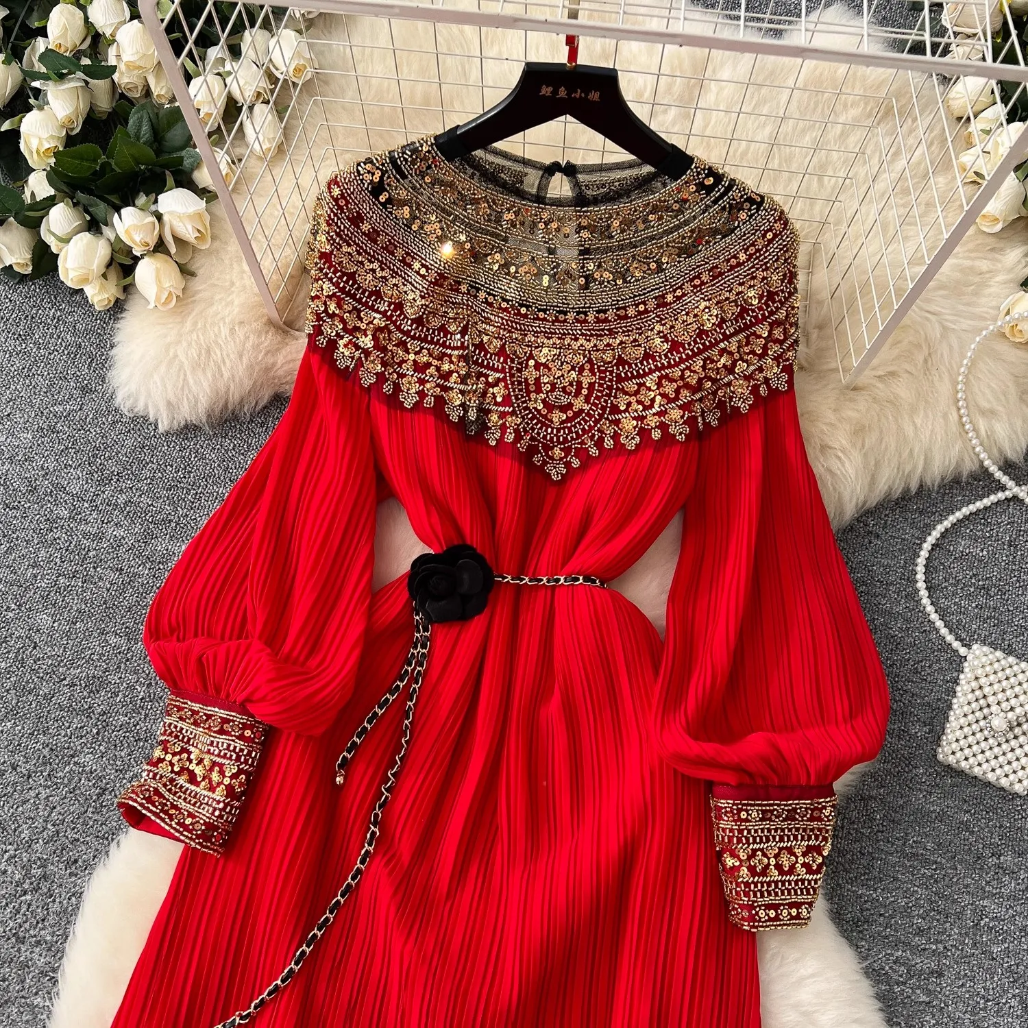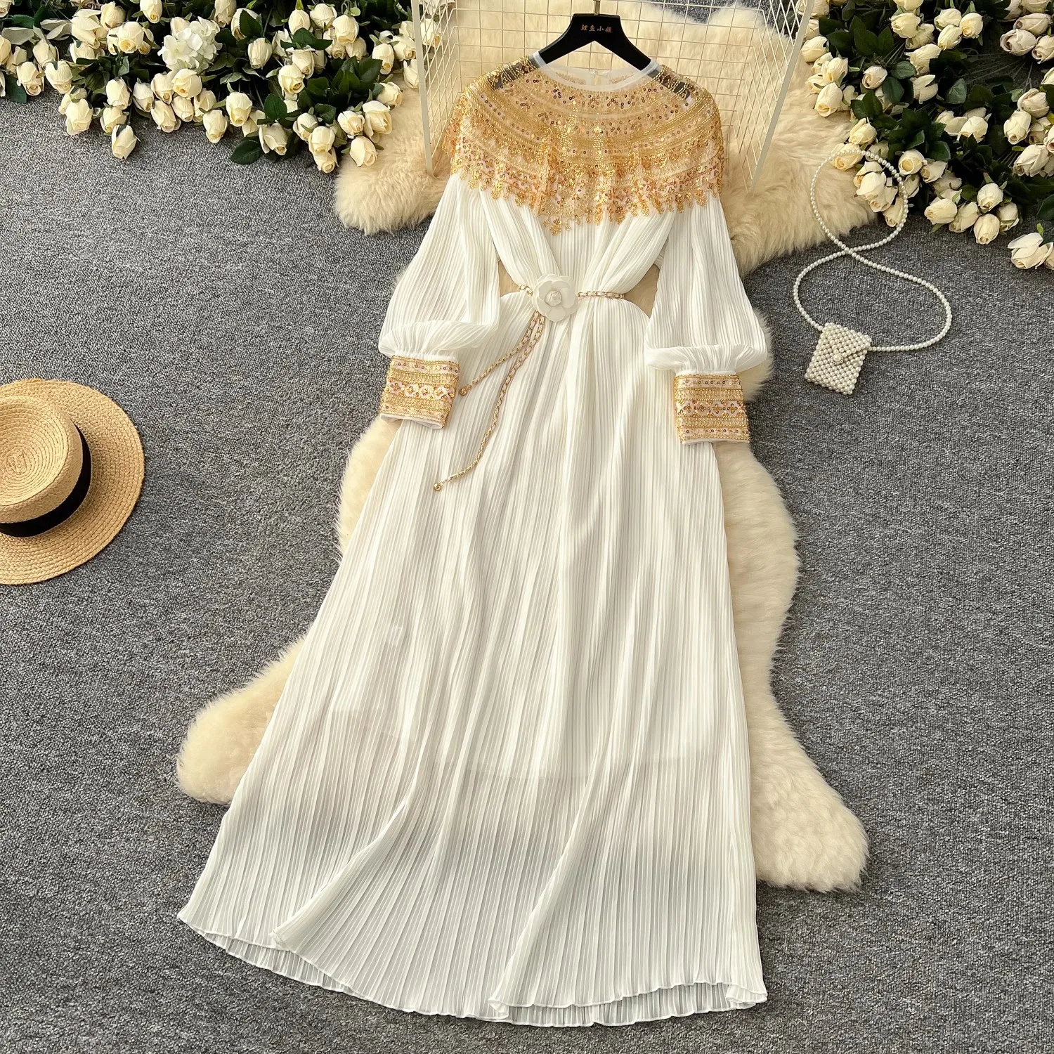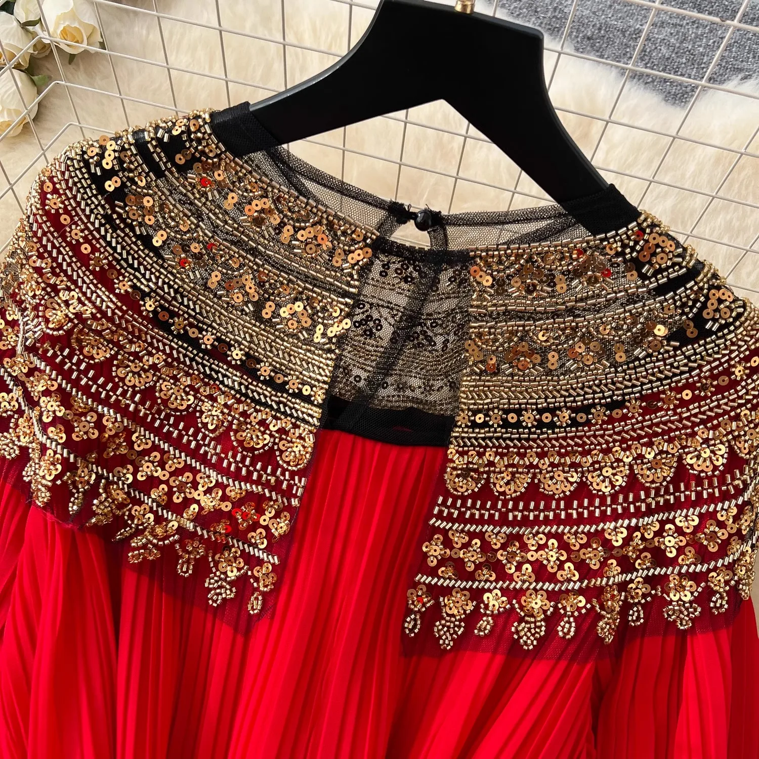 Luxury Shine Sequined Embroidery Beading Cape Splice Chiffon Formal Occasion Dresses Women Floral Belt Loose Robe Party Clothing