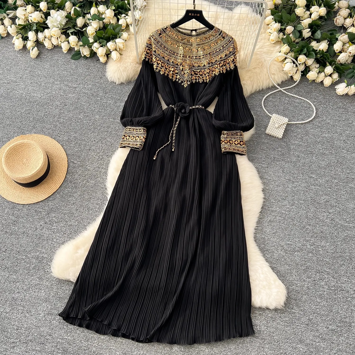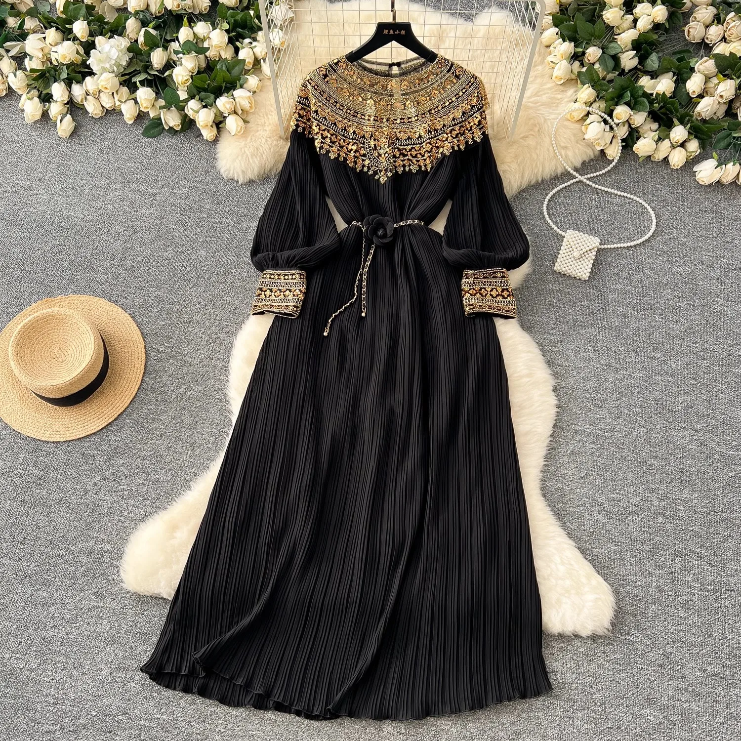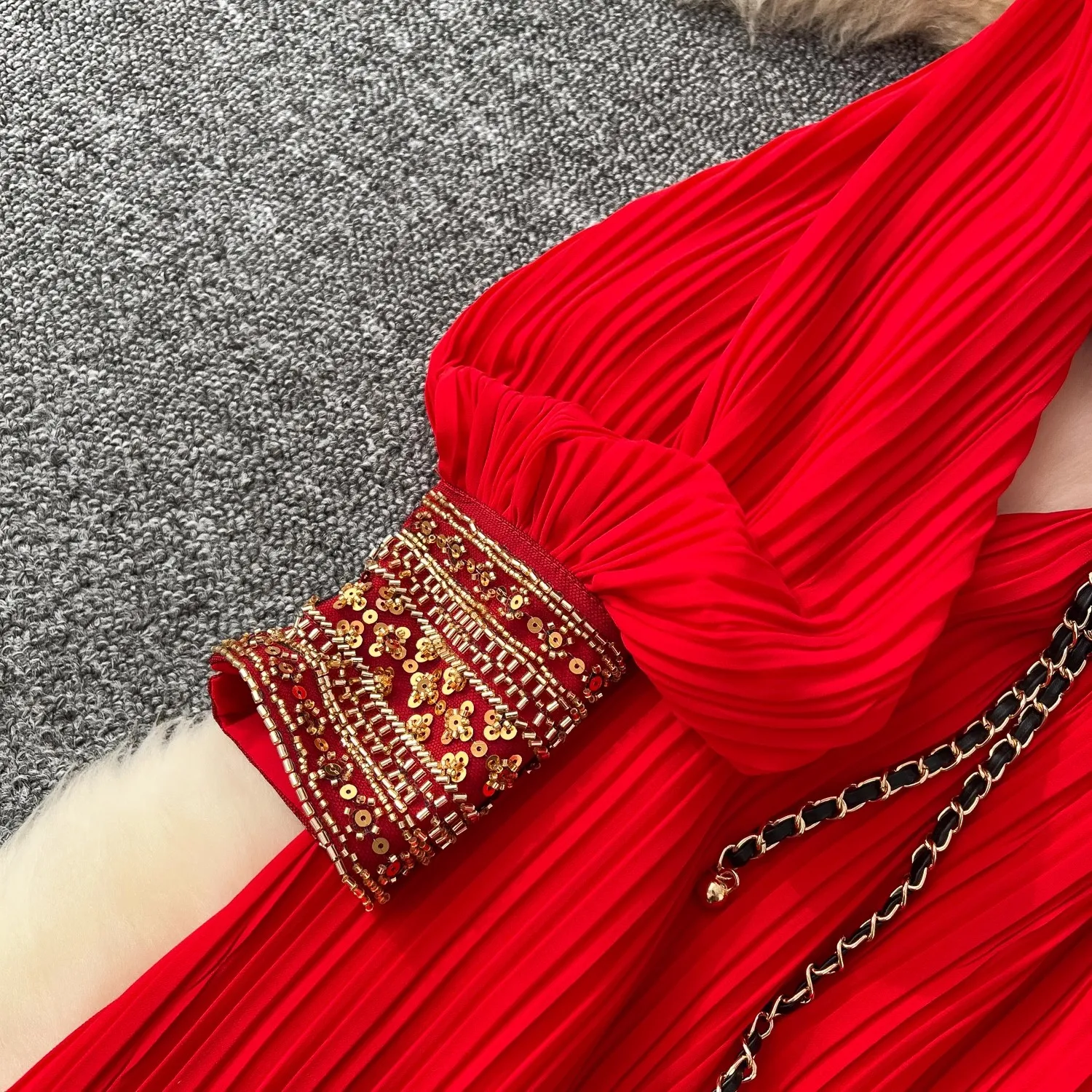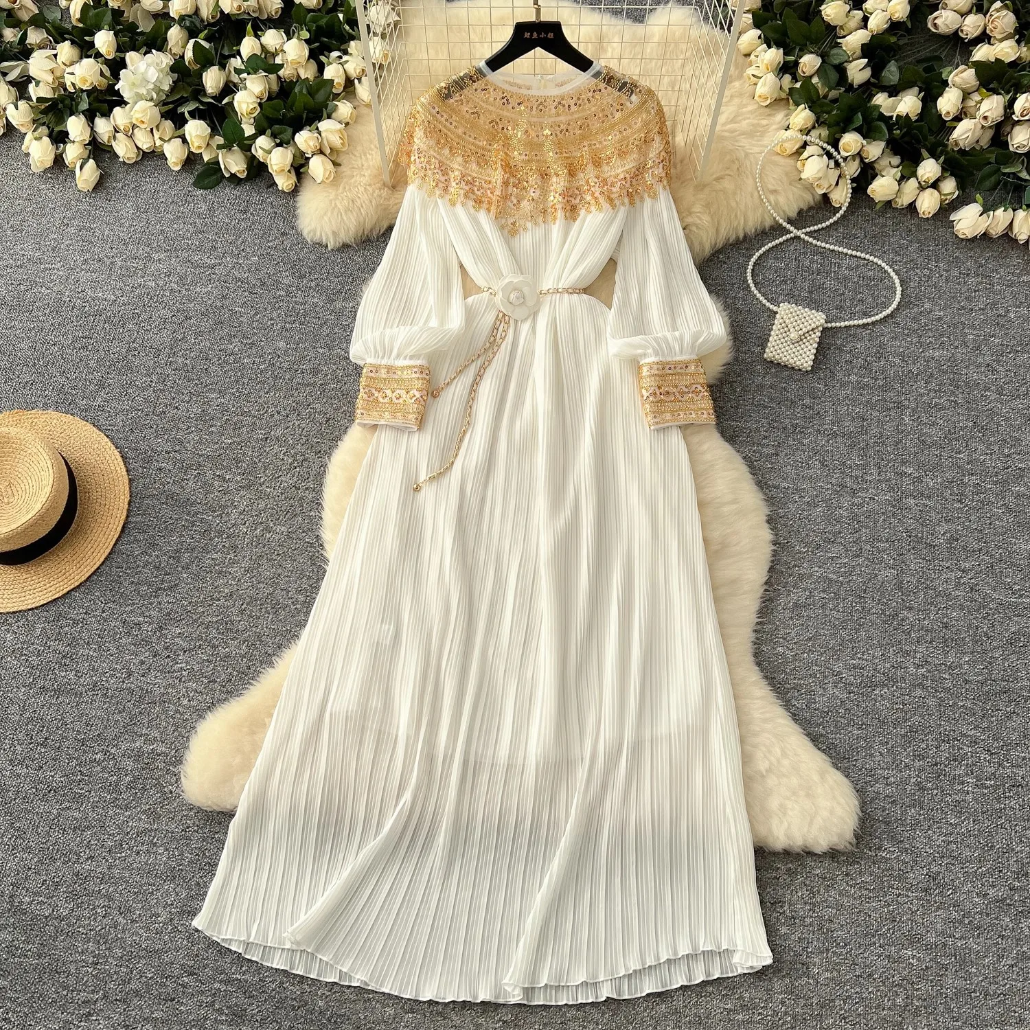 Luxury Shine Sequined Embroidery Beading Cape Splice Chiffon Formal Occasion Dresses Women Floral Belt Loose Robe Party Clothing
