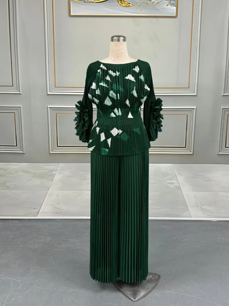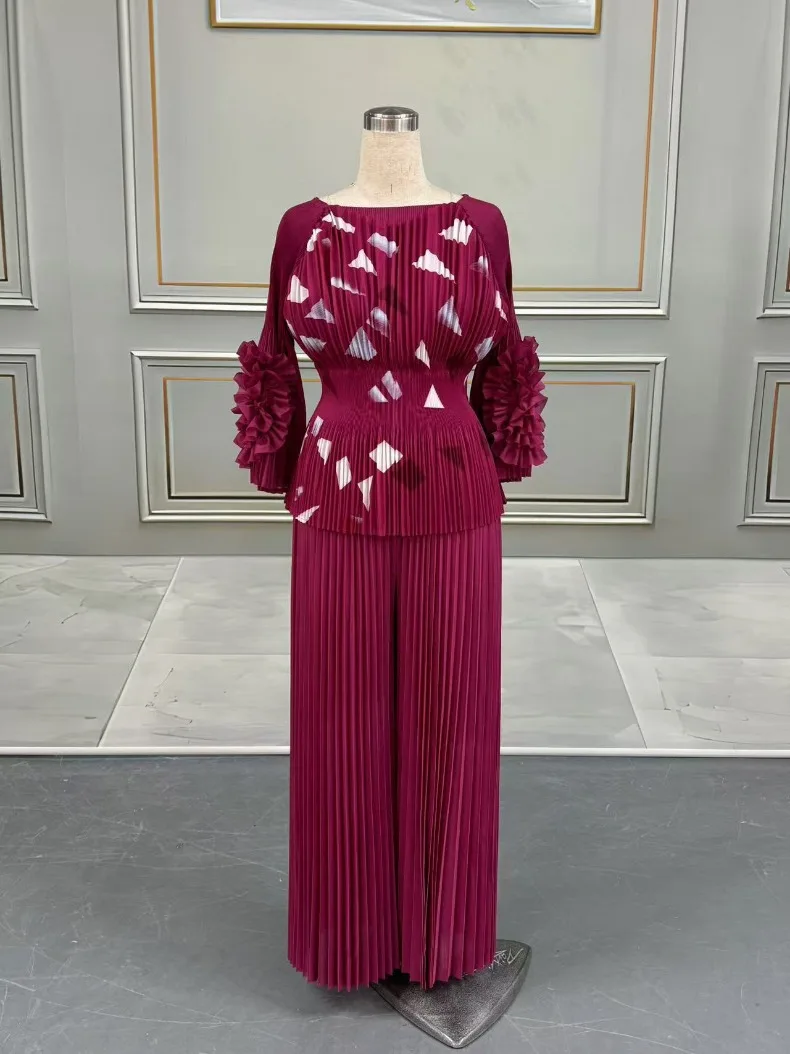Pleated Print Pants Set T Shirt + Wide Leg Trousers Loose