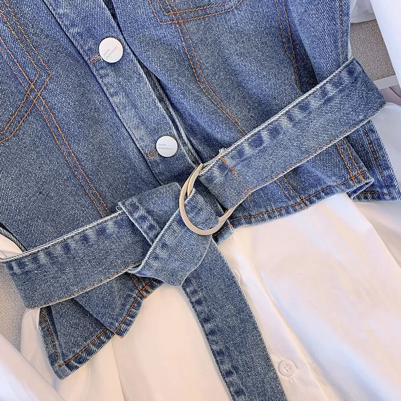 Women Denim Shirt Spring Summer 2025 Long Sleeve Splicing Ladies Tops Fake Two Pieces Fashion Loose Lady Blouse Female Denim Top